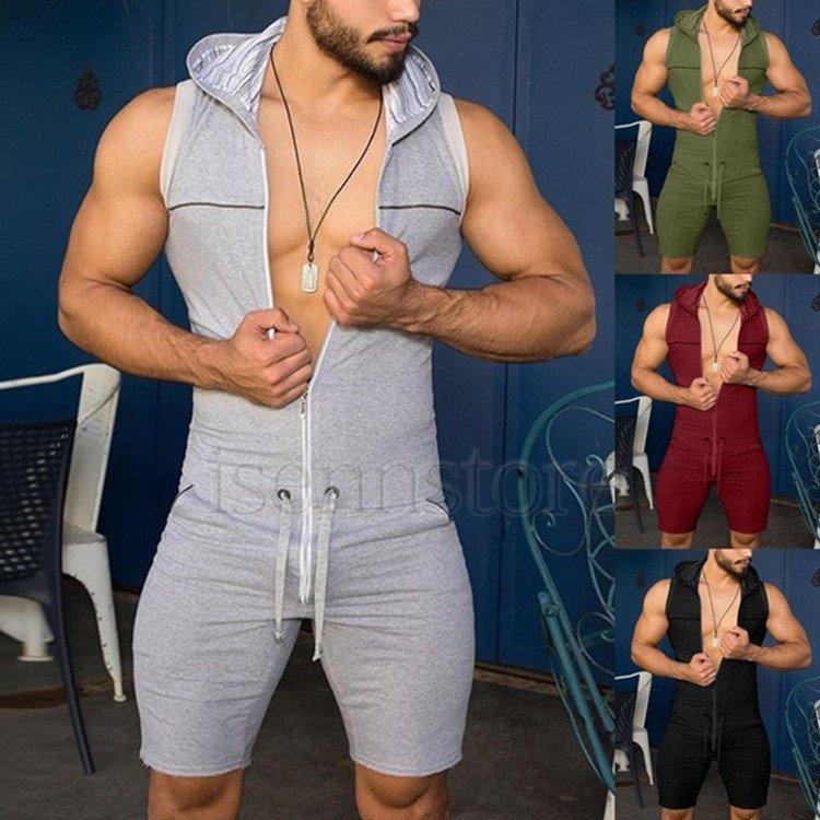 ジャージ メンズ つなぎ 上下セット ノースリーブパーカー オーバーオール フード付き ハーフパンツ サロペット サマー 夏 スリム 細身 体型カバー