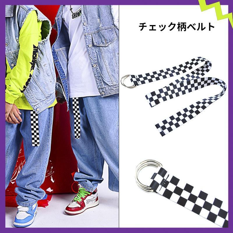 ブラックホワイトチェック柄ベルト ダンス衣装キッズヒップホップ リングベルト ロゴテープ ダンスファッション