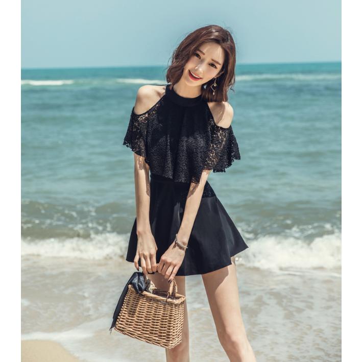 レディース 水着 体型カバー ワンピース スカート付き プチプラ レース 肩だし スウィムウェア
