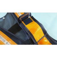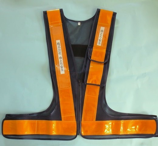 安全反射ベスト 名札 社名 工事名等入れ 透明ビニール無線機等ポケット付 150×100×30mm紺メッシュ 反射黄(黄金色)60mm幅 フリーサイズ Lサイズ着丈60cm ウェスト最大130cm肩部すべり止め加工 前面ファスナー止め