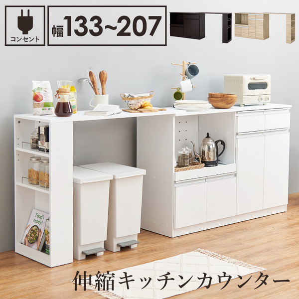 3色から選べるシリーズ 伸縮 キッチンカウンター 幅133〜207cm 収納家具 キッチン収納 キッチンカウンター カウンターワゴ
