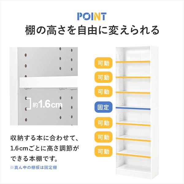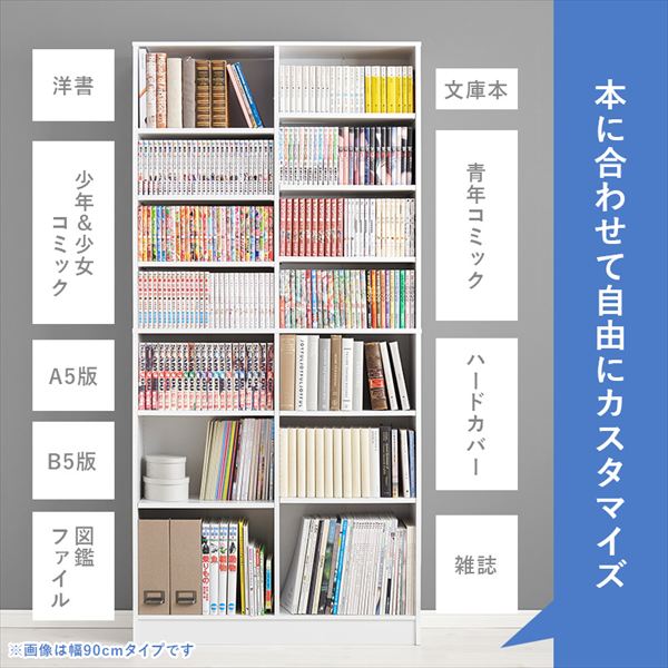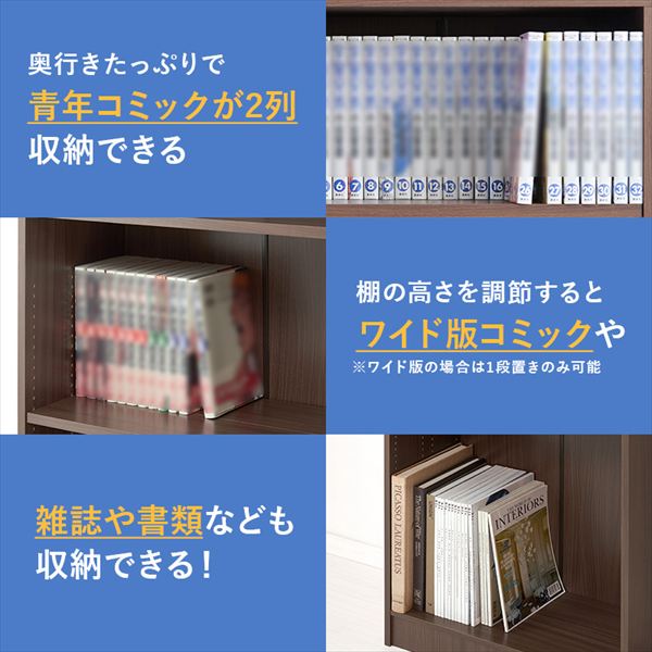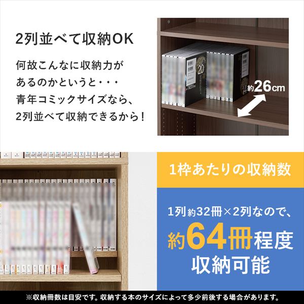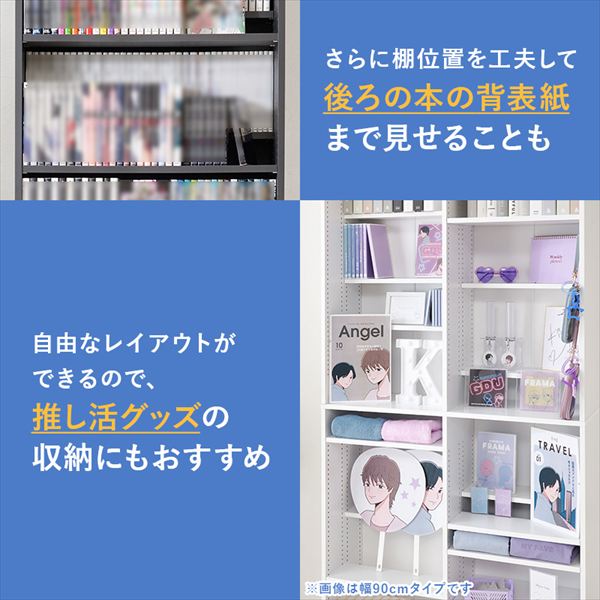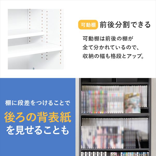 前後2列別々に棚板高さが変えられ、大容量収納できるマンガ好きの為の本棚