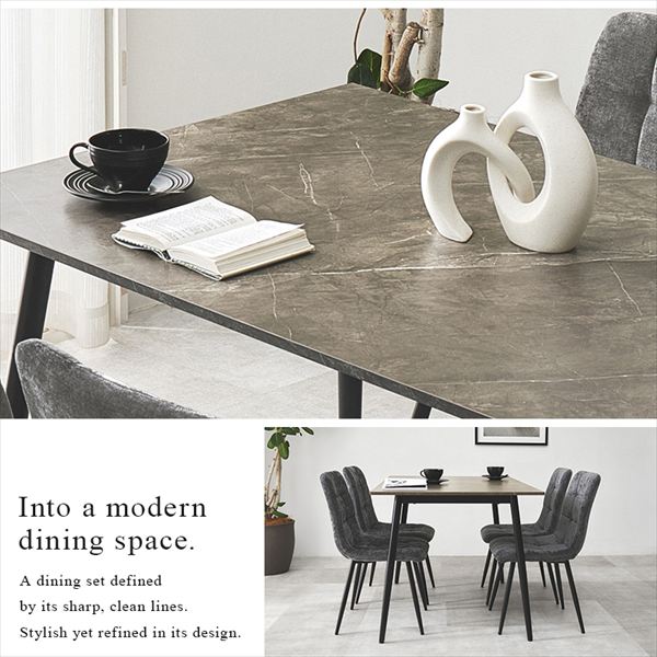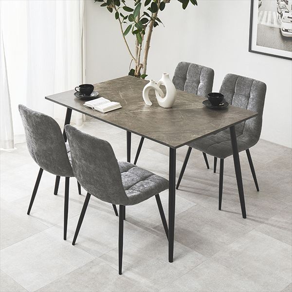 モダンインテリアに映えるグレーの大理石調の天板と細身のブラックアイアンの脚がおしゃれな大人のダイニングを演出します