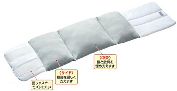 ●面ファスナーでズレにくい、〈サイド〉横腰を優しく支えます、〈中央〉腰と敷具を埋め支えます