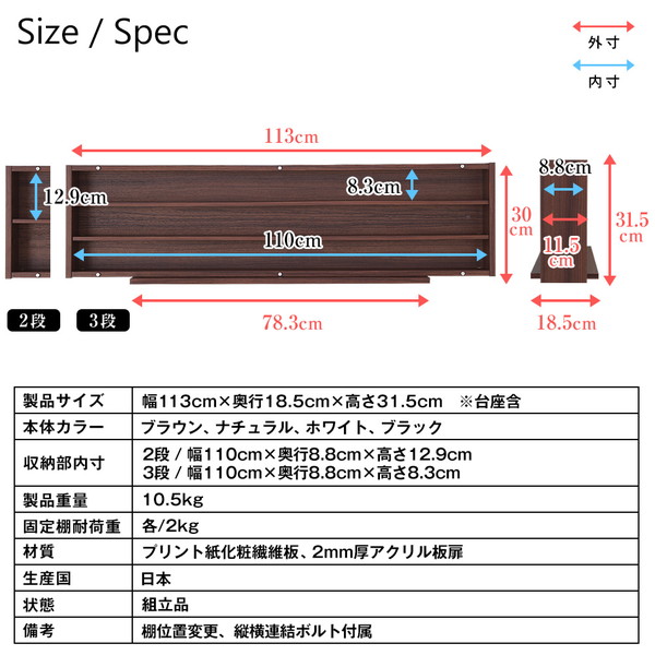 ・2段の場合:幅110cm×奥行8.8cm×高さ12.9cm