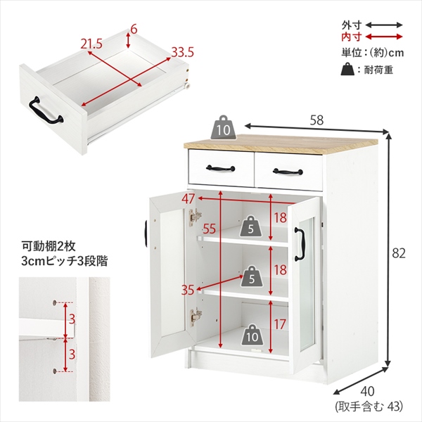 商品名:キッチンラック 扉収納タイプ 幅58cm 伸縮キッチンカウンターSET