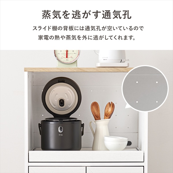 スライド棚には2口コンセントが付いており、作業台としても使いやすい高さがポイント