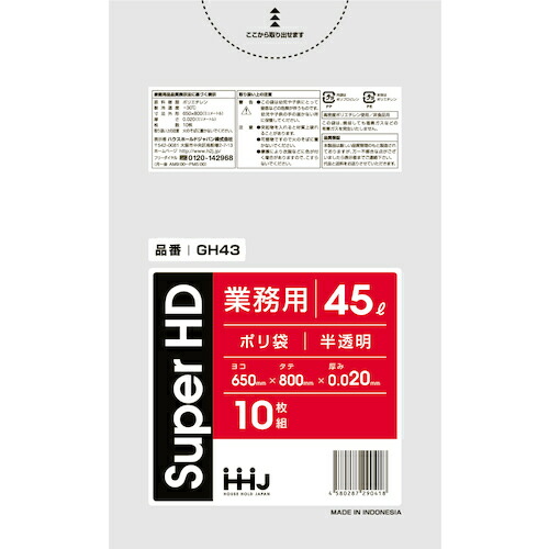 【在庫処分】ハウスホールドジャパン(HHJ) ポリ袋 45L半透明 10枚 0.020 【品番:GH43】