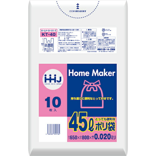 ハウスホールドジャパン(HHJ) ポリ袋 45L半透明手付き 10枚0.020 【品番:KT40】