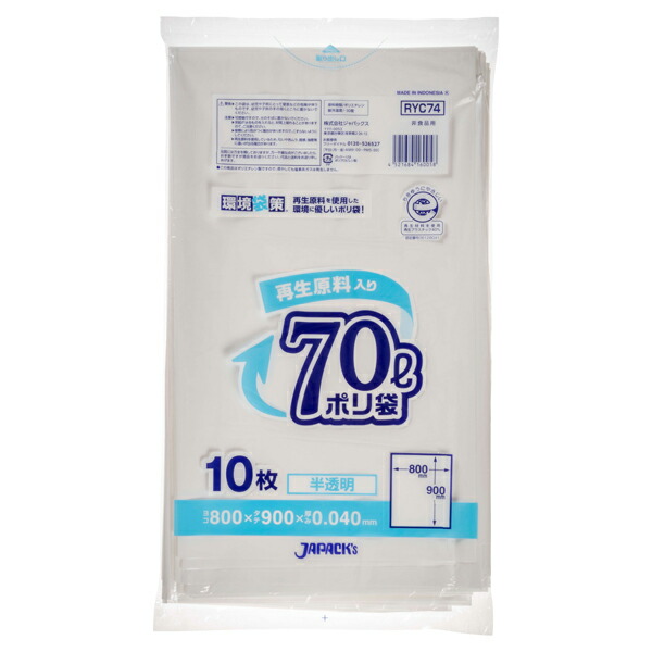 ジャパックス(JAPACK's) 環境袋策 70L 半透明 10枚(再生原料40%使用、エコマーク付き) 【品番:RYC74】
