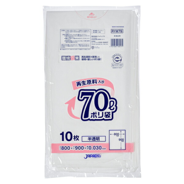 ジャパックス(JAPACK's) 環境袋策 70L 半透明 10枚(再生原料40%使用、エコマーク付き) 【品番:RYM79】