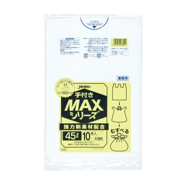 ジャパックス(JAPACK's) 業務用MAX 手付き 45L 半透明 10枚 【品番:SH43】