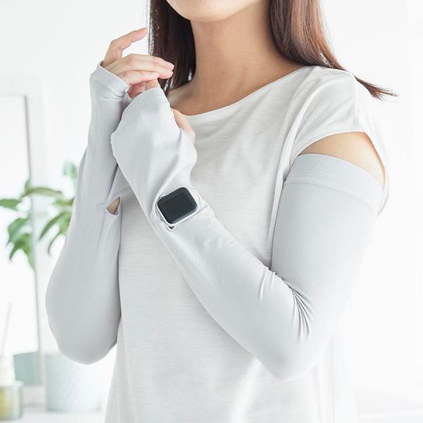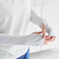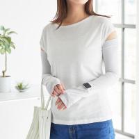 ●ロング丈なので二の腕まで紫外線対策ができ、 肌に触れた時にひんやり冷たい接触冷感機能付き。