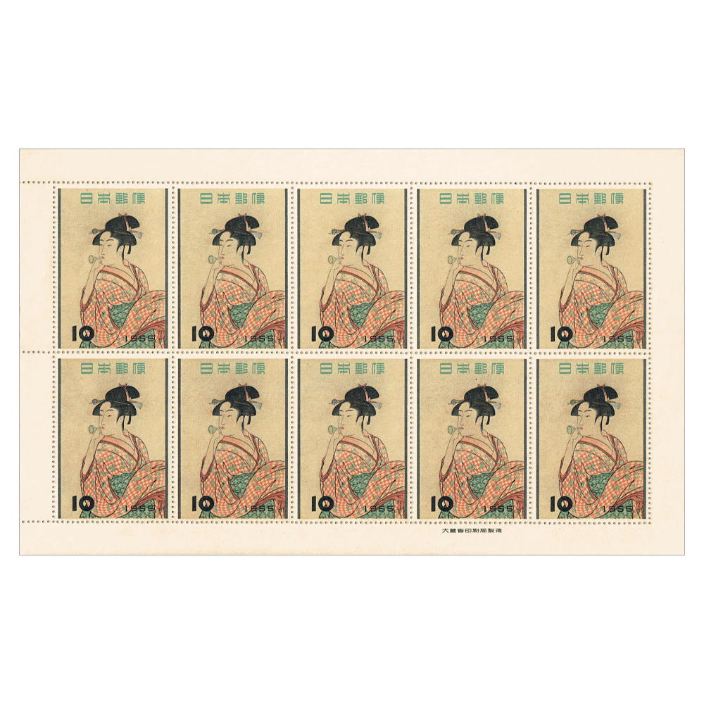 切手趣味週間 「ビードロを吹く娘(喜多川歌麿)」 昭和30年(1955) 10円切手 10面シート