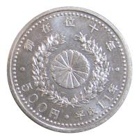 富士山や菊がデザインされていて、華やかながらも気品のある天皇在位記念硬貨です。