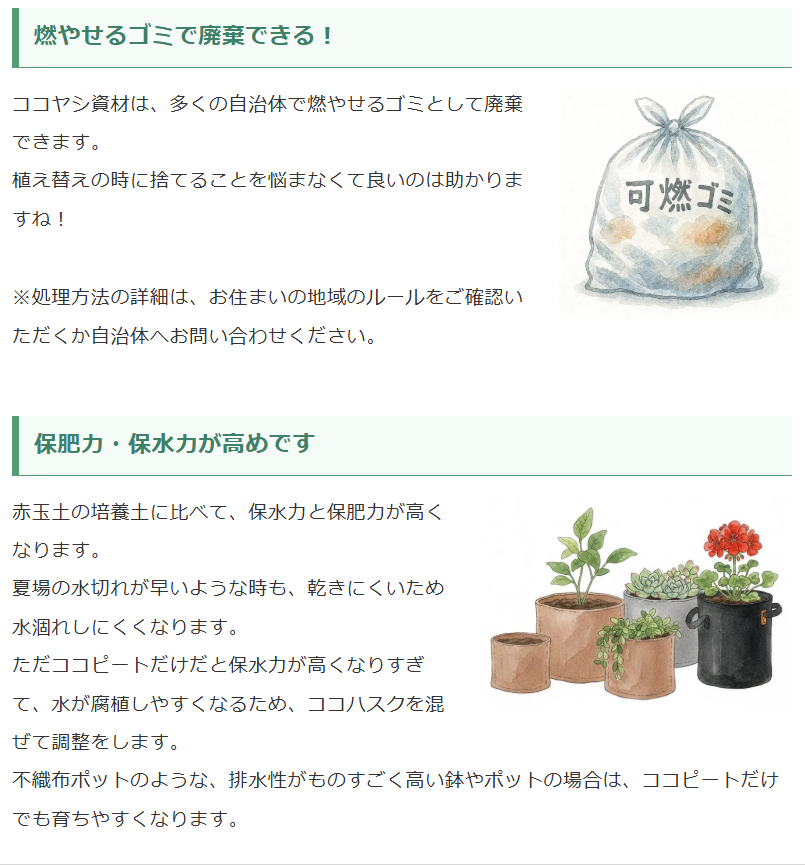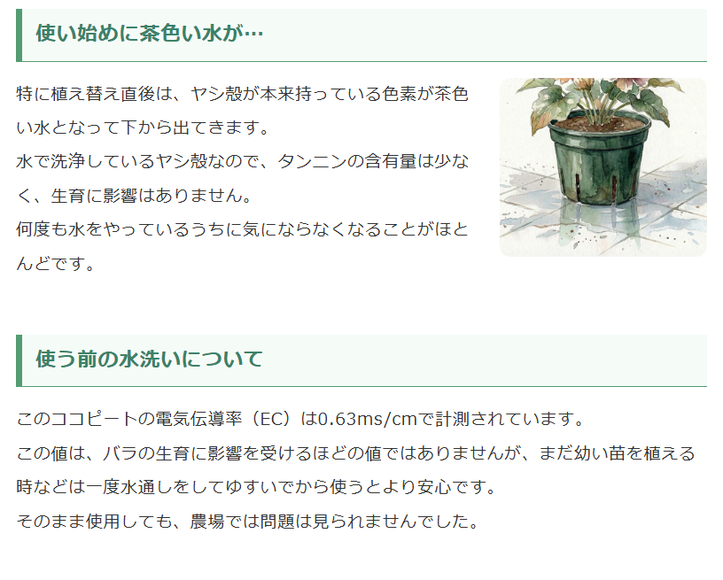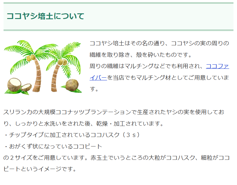 生産地にて水洗いを行ったヤシ殻から、繊維部分を取り除いた粉末を厳選し、乾燥・ふるい掛けをしたおがくず状の用土です。