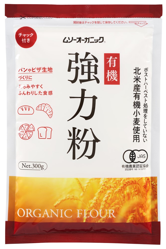 北米産有機小麦を使用した強力粉。ご家庭のホームベーカリーで簡単に本格的なパン作りがお楽しみいただけます。国内の有機JAS認証工場で製粉されています。