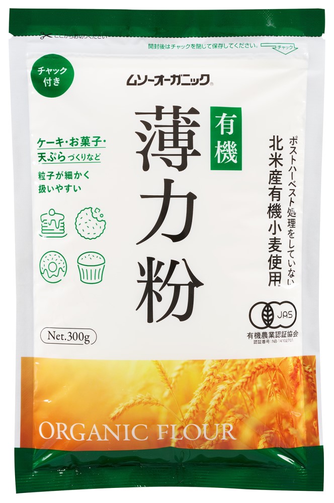 良質の北米産薄力小麦を100%使用した薄力粉。粒子が細かく軟質な為、ケーキ、お菓子、天ぷら作りなどに適しています。ポストハーベスト処理をしていないオーガニック原料を使用し、国内の有機JAS認証工場で製粉されています。