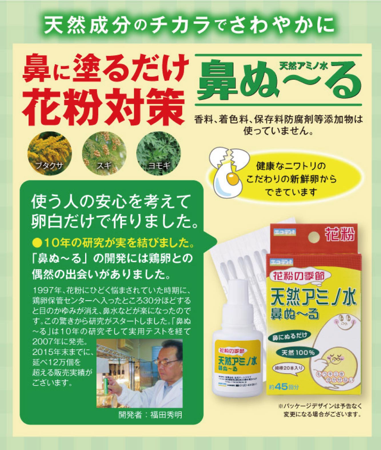 安全性を重視した「鼻ぬ〜る」は、香料・着色料・保存料・防腐剤等無添加