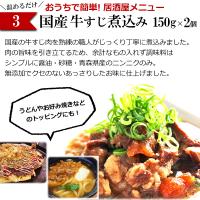 | 国産 牛すじ煮込み | 150g × 2P | 牛スジ肉(国産)、醤油、砂糖、ニンニク (一部に小麦・牛肉・大豆を含む) |