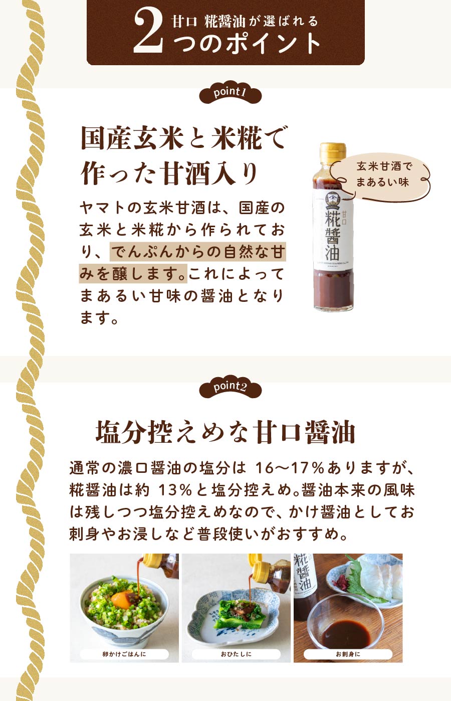 「糀醤油」は、大野町に伝わる江戸時代の文献にもある通り、醤油に甘酒を加えて、お客様にお出しする「最上醤油」を作ったという記録を基に仕上げました。