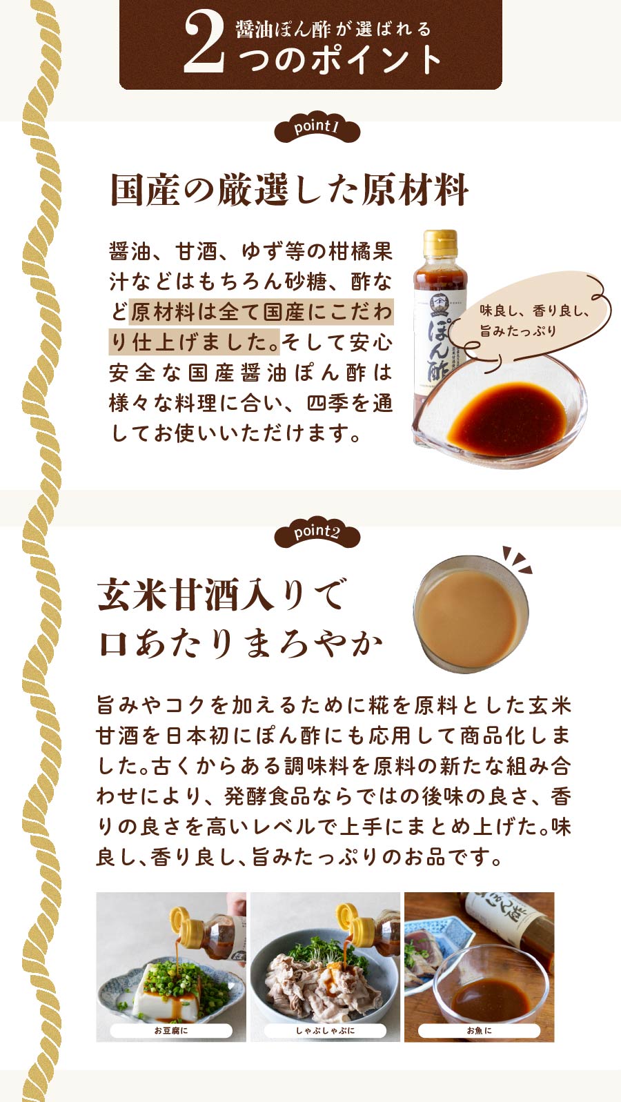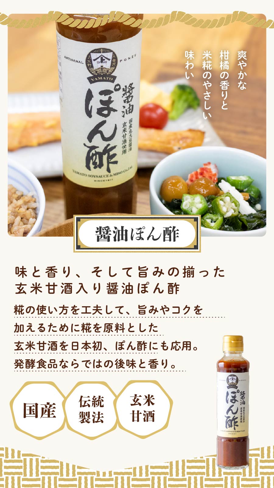 日本で初めて玄米甘酒を加えたぽん酢は国産柑橘果汁の香りを活かす、やさしい味わい。味良し、香り良し、旨みたっぷりのお品です。