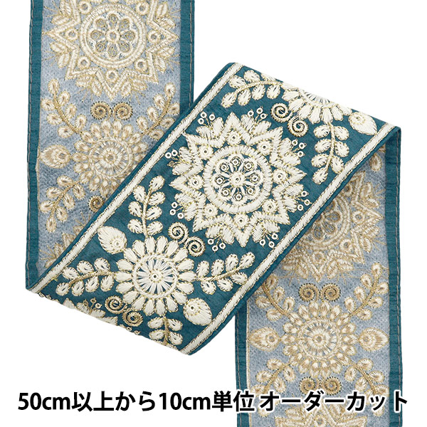 [刺しゅう ししゅう リボン りぼん 装飾 服飾 アクセサリー インテリア 雑貨 インド刺繍リボン インドししゅう インド刺しゅう 青緑 生成 金]