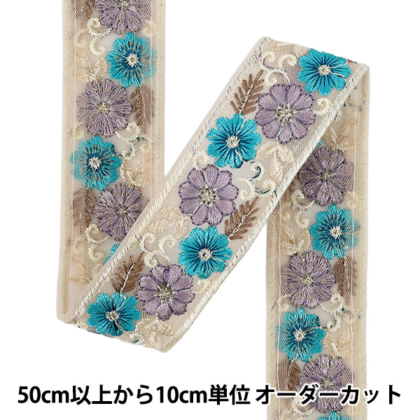 【数量5から】 手芸ブレード 『2026インド刺繍ブレード 約4cm幅 ベージュ×ブルー M-5073I』
