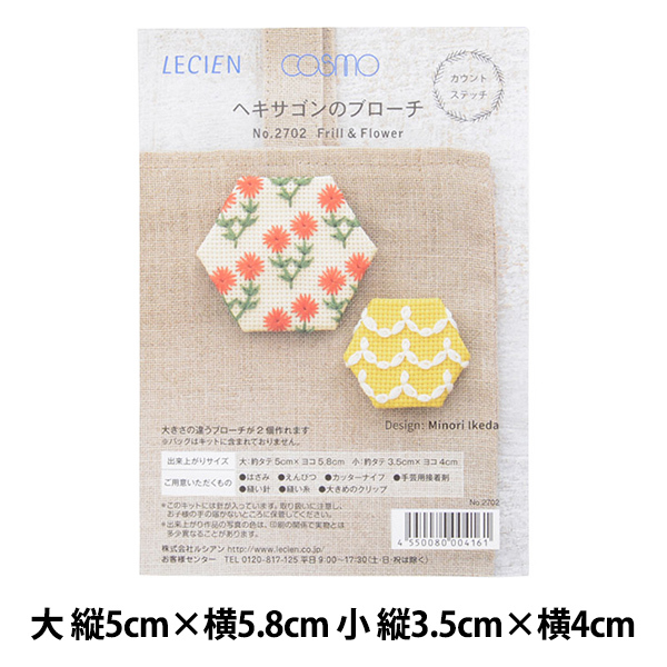 刺しゅうキット 『ヘキサゴンのブローチ フリル&フラワー 2702』 LECIEN ルシアン cosmo コスモ手軽にハンドメイドを楽しみましょう♪バッグや洋服に付けて装いを楽しめるヘキサゴン(六角形)のブローチです。