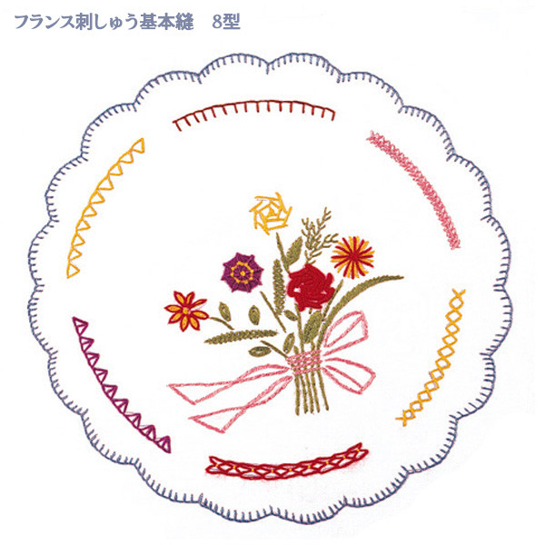 フランス刺繍、家庭科教材に最適のおすすめステッチ、図案は布にプリント済なので安心です。