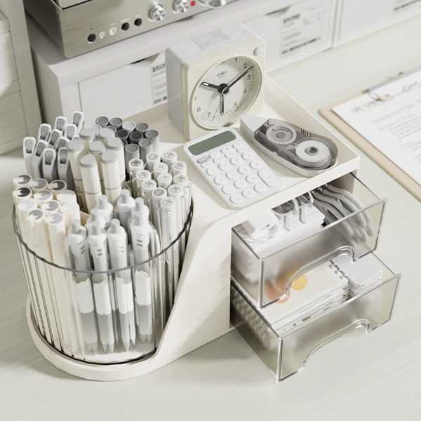 【互換品】引き出し付き 収納 引き出し 回転式ペンホルダー デスク整理用オーガナイザー 文房具デスク 白い学生