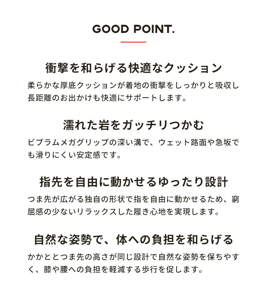 長距離のトレイルランニングや登山に適した高機能シューズ。厚みのあるミッドソールが地面からの衝撃を和らげ、長時間の使用でも快適な履き心地を維持。内側のガイドレイルと広い接地面積が、抜群の安定感を提供します。アウトソールにはVibram Megagripソールを使用し、優れたグリップ力を発揮。濡れた路面や乾いた地面でも安定感を発揮し、さまざまな環境で確実な足運びを実現します。また、広めのつま先設計が足の圧迫感を軽減し、快適さをサポートします。