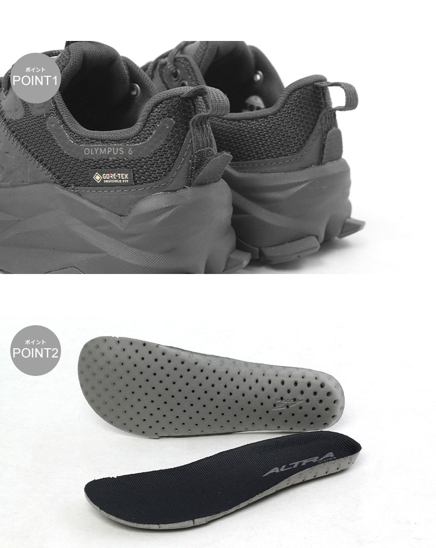 アルトラより「オリンパス 6 ハイク ロー GTX」です。 軽量で防水性に優れたOLYMPUS 6 HIKE LOW GTXは、一日中快適に歩けるハイキングシューズ。GORE-TEX Invisible Fitの防水ライニングと耐久性の高いレザーアッパーを採用し、安定したフィット感を実現。Vibram Megagripアウトソールが、濡れた路面でも高いグリップ力を発揮。ゆとりあるFootShape Fitで、長時間の行動も快適にサポートします。 |
