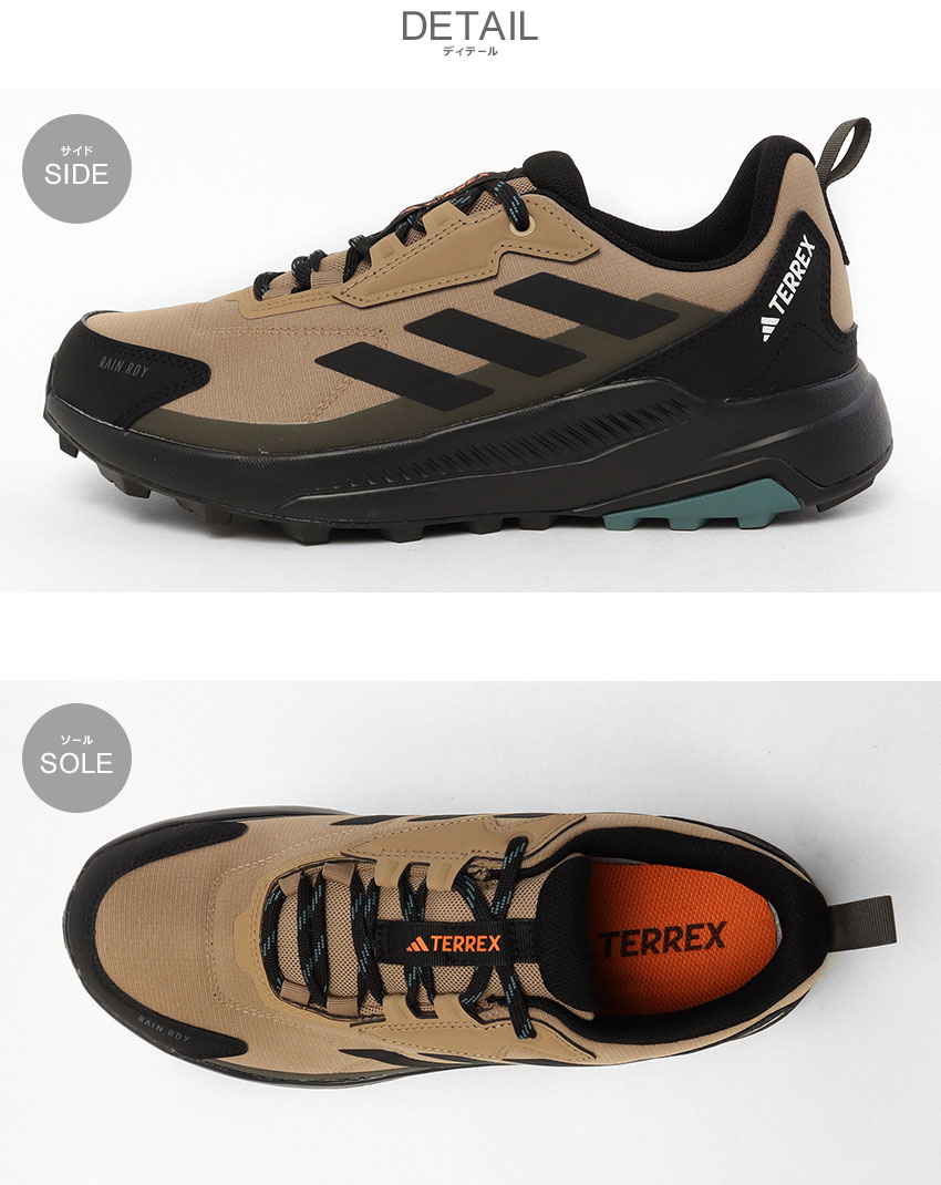 アディダスより「TERREX ANYLANDER R.RDY」です。 リサイクル素材や再生可能素材を一部に使用した、防水仕様のハイキングシューズ。自然の中を歩く散策から、本格的なトレイルまで幅広く対応します。ぬかるんだ道や土埃の多いルートでも安定した歩行をサポート。足首をしっかりと支えるミッドカット仕様で、歩行時の安定感を高めています。クッション性に優れたミッドソールが快適な履き心地を持続し、RAIN. RDY機能とガセット付きシュータンが雨や雪の侵入を防止。悪天候下でもシューズ内をドライで快適に保ちます。長距離の使用を想定した耐久性のある設計と、優れたグリップ力を発揮するTraxionアウトソールにより、さまざまな路面状況でも安心して着用できます。 |