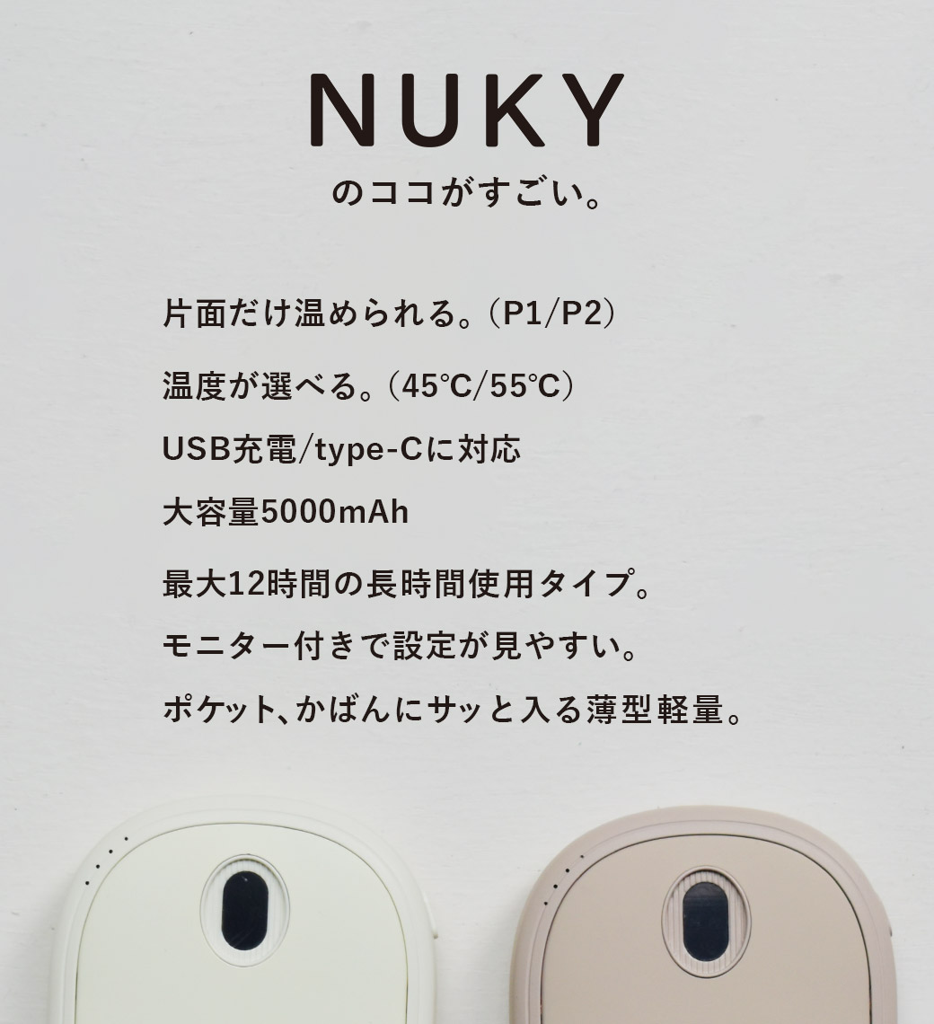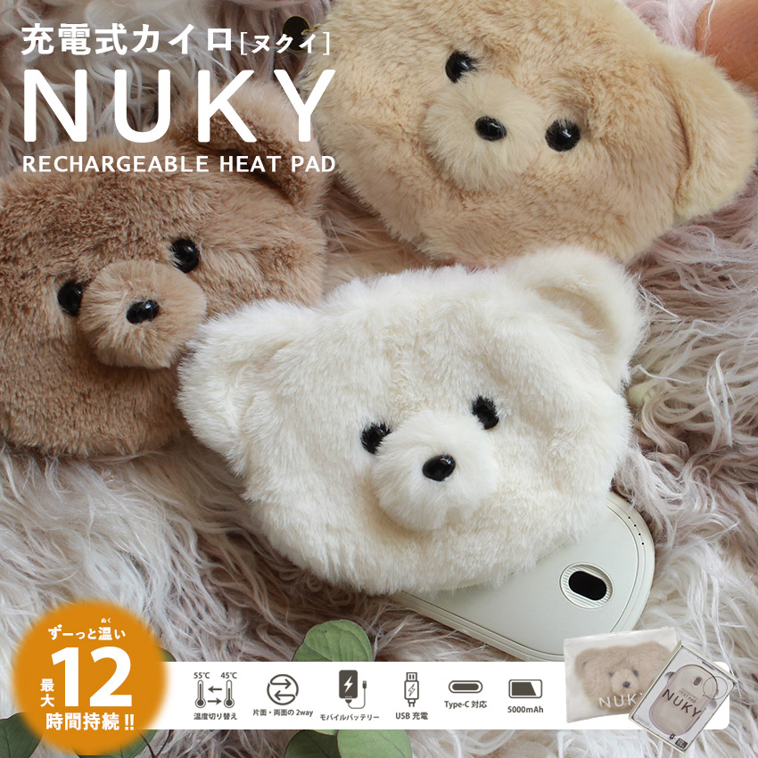 「ヌクイ」はくり返し毎日使えるECOで便利な充電式カイロです。 ・機能 45℃と55℃の2段階温度切り替え 保温面の切り替え(両面・片面)が可能 TYPE-C対応 5000mAhの大容量バッテリー ・セット内容 本体(USBカイロ)×1 充電用USBケーブル×1 ストラップ×1 ベアーカバー×1 取扱説明書 |