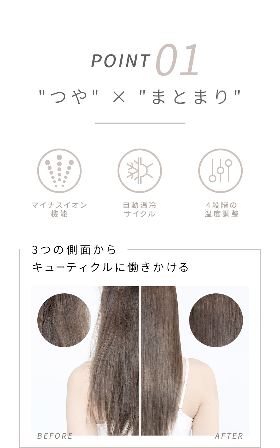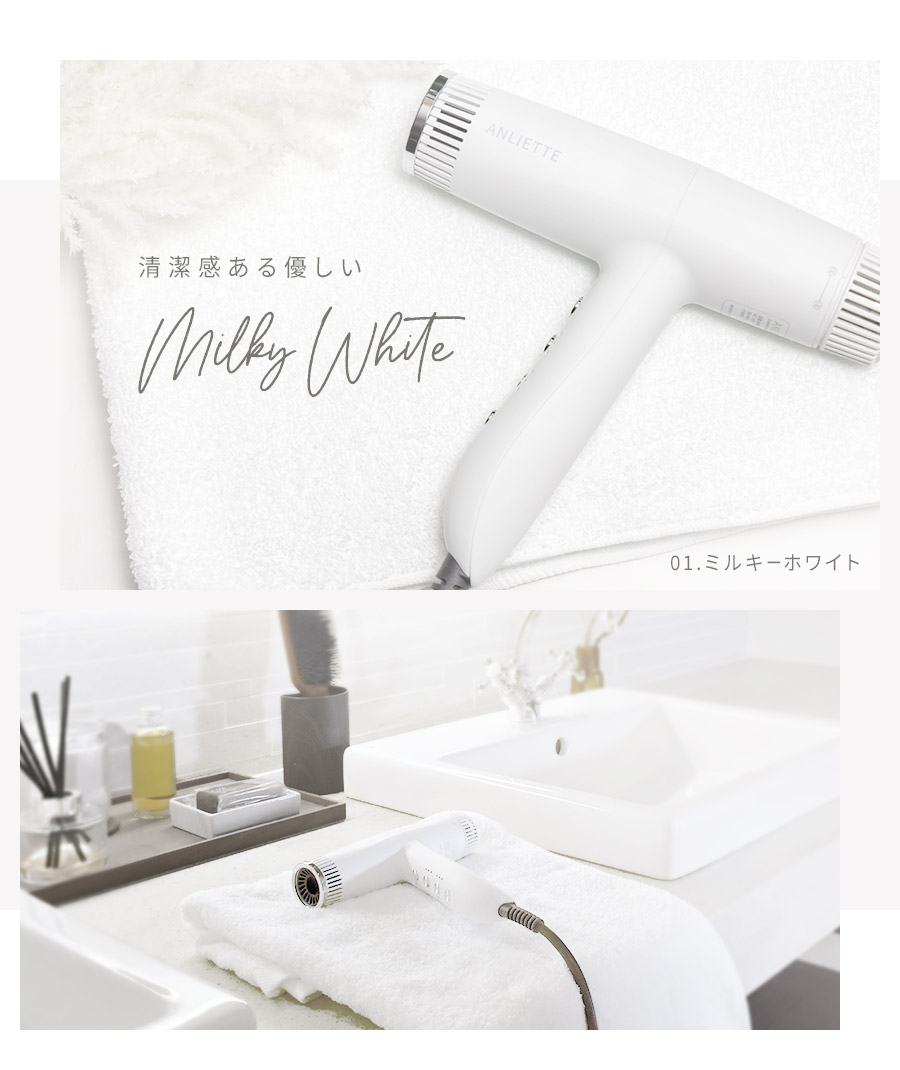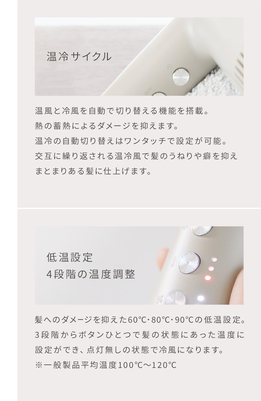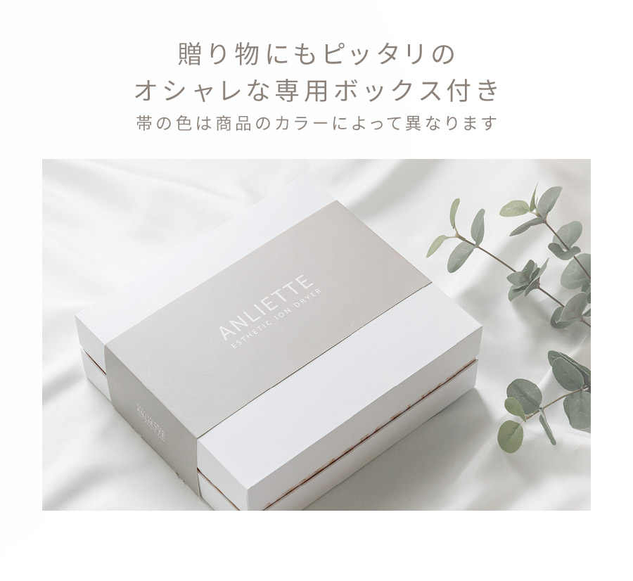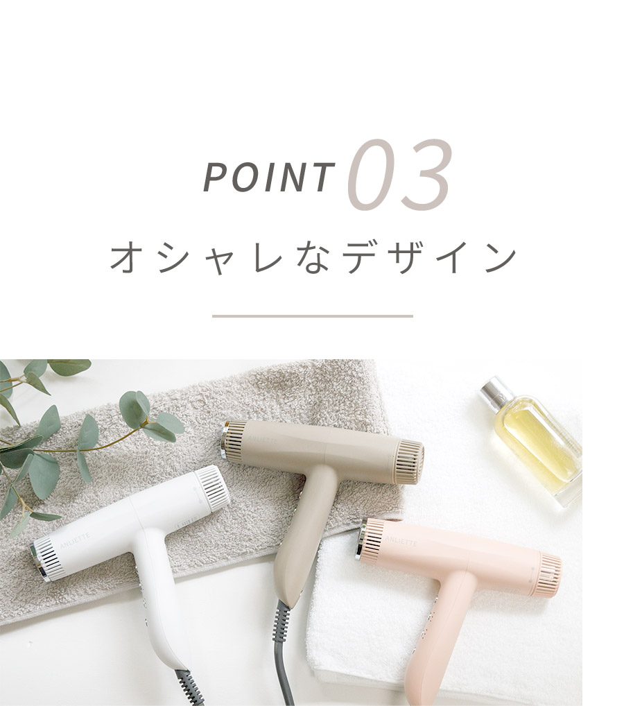 アンリエッテより「エステティックイオンドライヤー」 自動で切り替わる冷風と温風により、プロが乾かしたかのような"つや"のある美しい仕上がりに。 美容のプロである現役のエステティシャンが考案! ・1億個のマイナスイオンで髪を柔らかく滑らかに ・温冷サイクル/温度調整で熱によるダメージを抑える ・最大風量1.8m3/分の大風量で素早く乾かす ・約300gの超軽量で腕も疲れにくい ・マットな質感でオシャレなデザインとカラバリ ・2種のアタッチメント付き ・オートクリーニング機能付き ・贈り物にもピッタリのオシャレな専用ボックス 【付属品】 拡散ノズル×1 スムーズノズル×1 【1年間のメーカー保証期間】 安心してお使いいただけるよう1年間のメーカー保証期間を設けております。 取扱説明書その他の注意書きに従った正常な使用状態で、保証期間内に故障した場合にはお買い上げの販売店を通じ、ご購入から1年間、無償修理または交換をさせていただきます。 当店でご購入いただいたお客様については、保証書の販売店・お買い上げ日は空欄のままとなっておりますが、当店にて購入情報の管理を行っておりますためご安心ください。 |