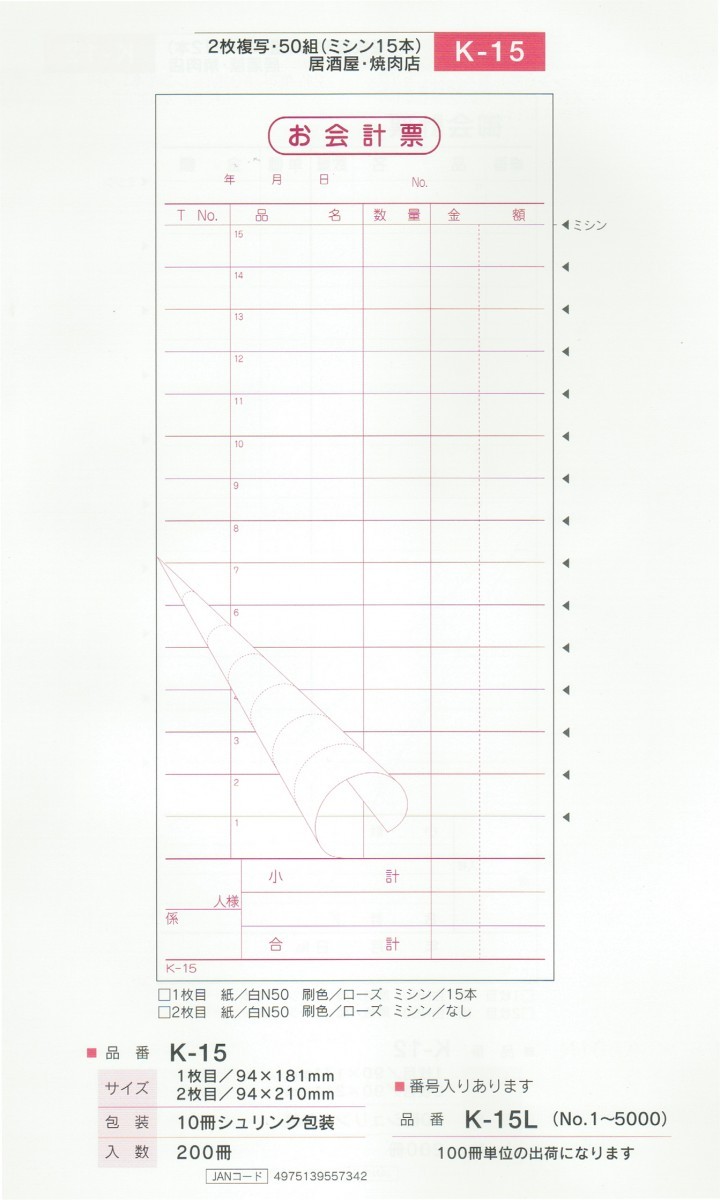 会計 伝票 複写 K-15 ミシン目入り 15行 50組 10冊 飲食店など