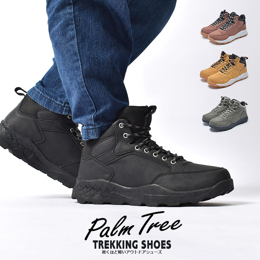 パームツリーより「トレッキングシューズ」です。 アッパーとシュータンの一体構造で内部への汚れや雨水の侵入を防ぐガゼットタン仕様のトレッキングシューズです。ソールは泥が詰まりにくく、地面をしっかりグリップするパターンを採用。重さも片足およそ420g(26.5cmを計測)の軽量設計。ソールから4cmまでの防水仕様になっているので、トレッキング、ハイキングだけでなく、フェスやキャンプなどのアウトドアシーンや、雨の日の通勤、通学にもおススメです。 |