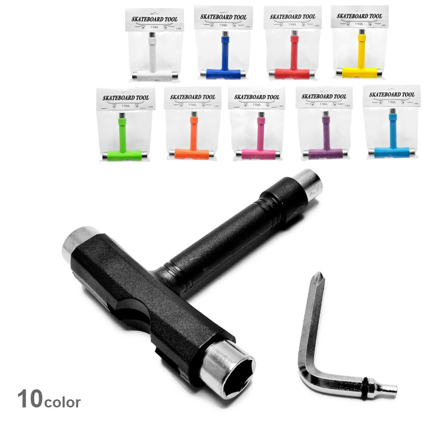 定番のスケートボード工具。デッキにトラックを固定するために必須のパーツ。これ1つでスケートボードのコンプリートデッキの組立、解体が可能です。T字の中に六角レンチが収納されています。