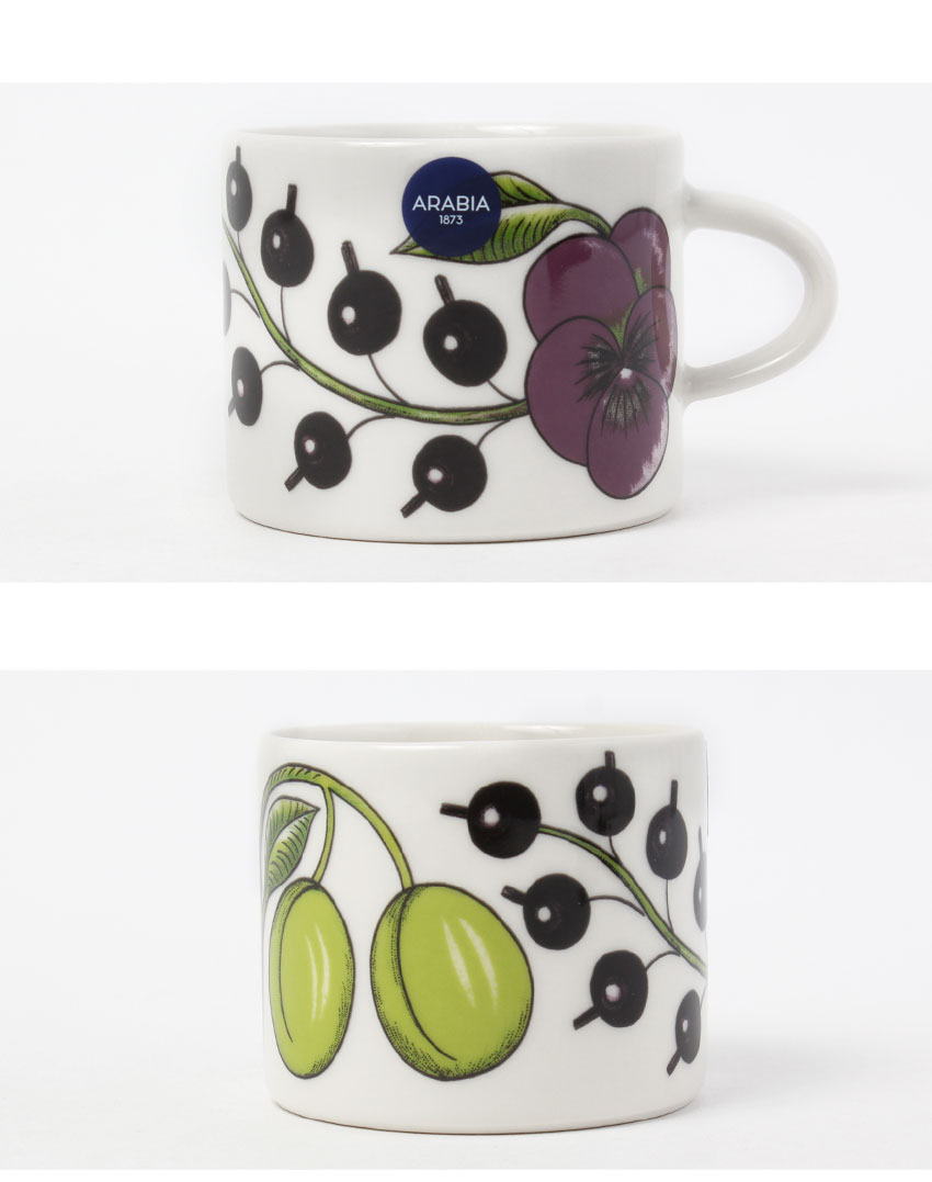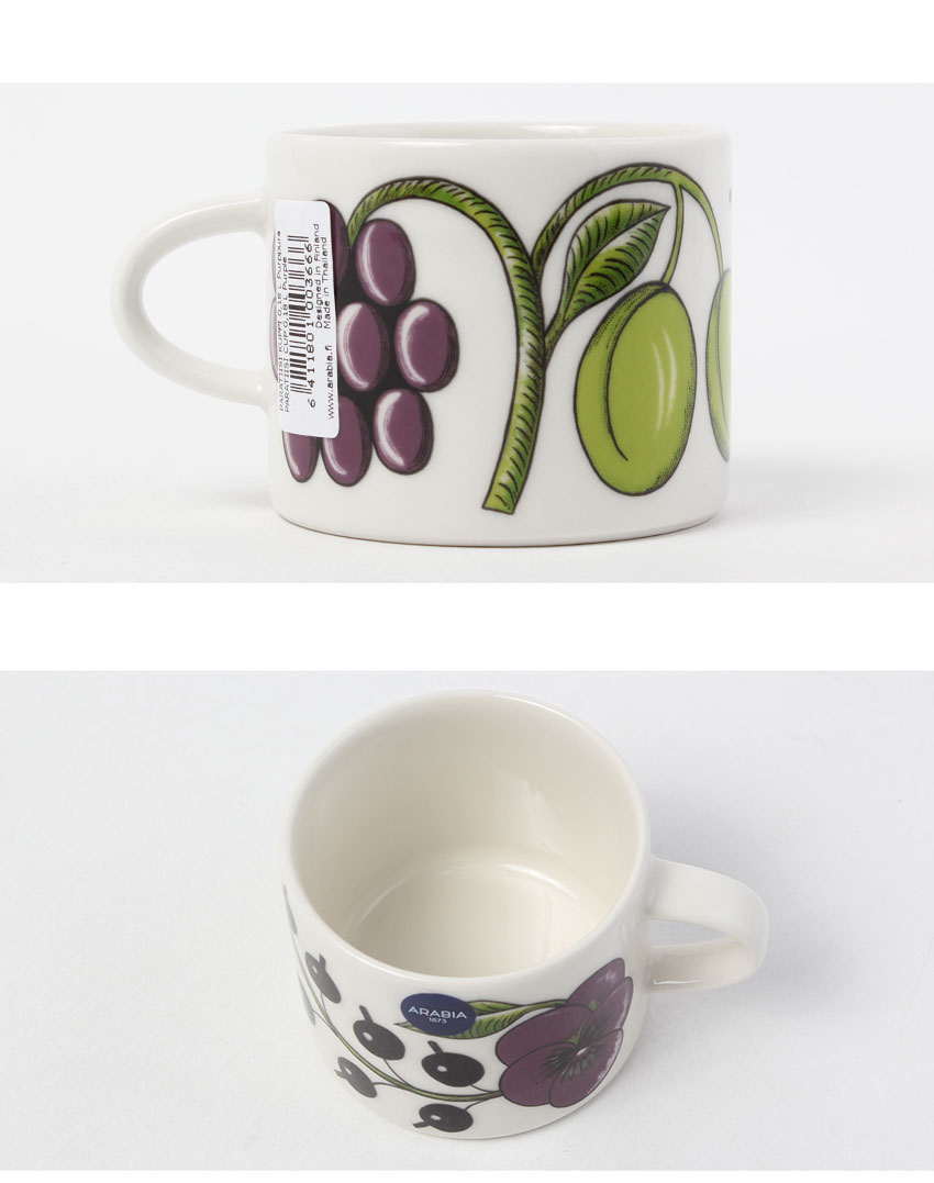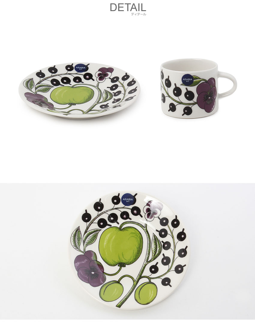 アラビアより「パラティッシ マグカップ&ソーサー」です。 1969年から愛され続けているアラビアのクラシックシリーズ「パラティッシ」。パラティッシからティーカップセットの登場です。緻密な構図で描かれたフルーツや花々と鮮やかな色彩が魅力的なデザインは、フィンランド語で「楽園」と名付けられました。カップはマグカップとして、ソーサーは小皿としてバラバラでも使えるデザインとなっており、毎日でも使いたくなるようなおしゃれな逸品です。 |