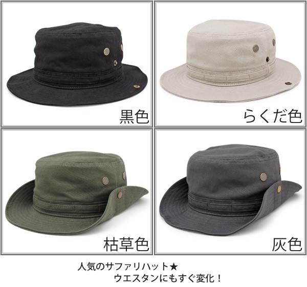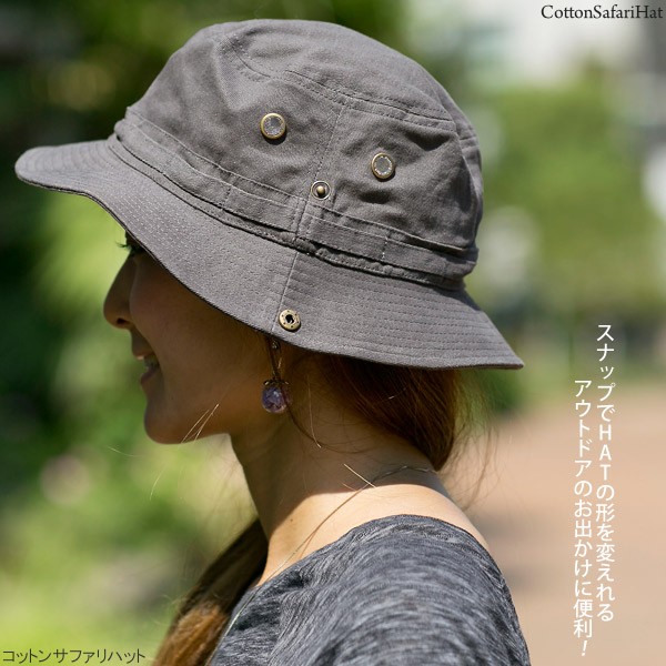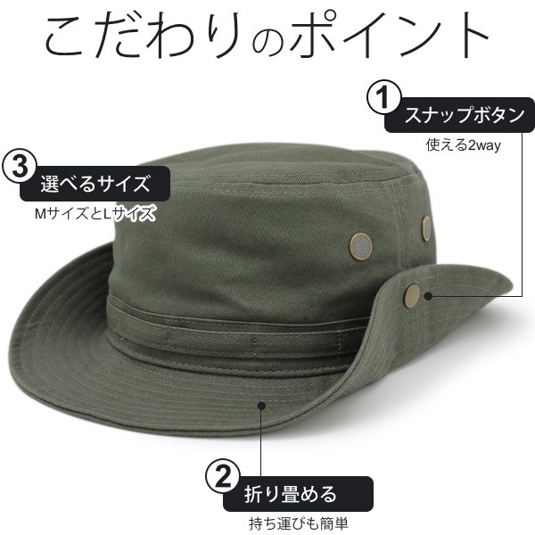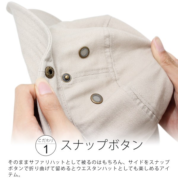 そのままサファリハットとして被るのもOKですが、サイドのスナップボタンを留めればウエスタンハットとしても楽しめるアイテムです。