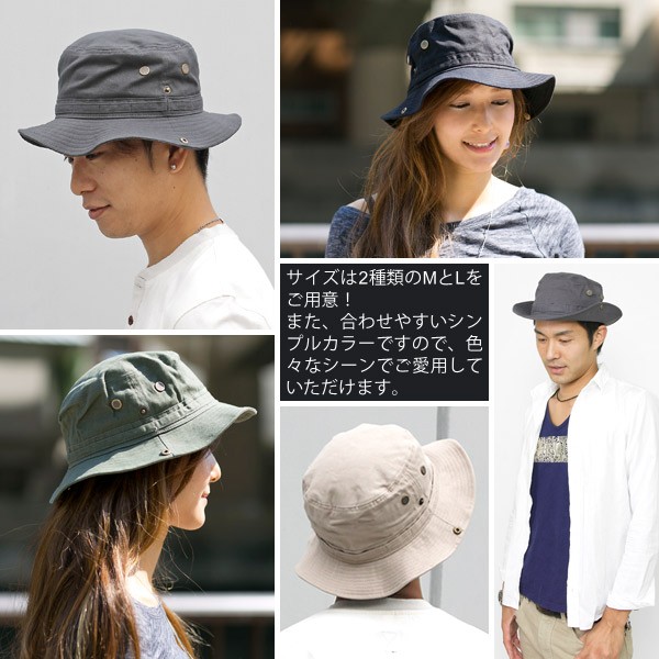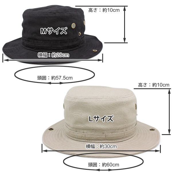 | サイズ | Mサイズ:表記57.5cm(頭囲:約57.5cm、高さ:約10cm、横幅:約28cm[つばも含む]、つばの長さ:約6cm) Lサイズ:表記59〜61cm(頭囲:約60cm、高さ:約10cm、横幅:約30cm[つばも含む]、つばの長さ:約6cm) |