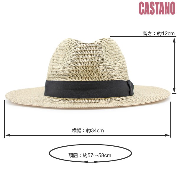 | サイズ | サイズ表記58cm(頭囲:約57〜58cm[紐でサイズ調整可能]、高さ:約12cm、横幅:約34cm[つばも含む]、つばの長さ:約7.5cm) |