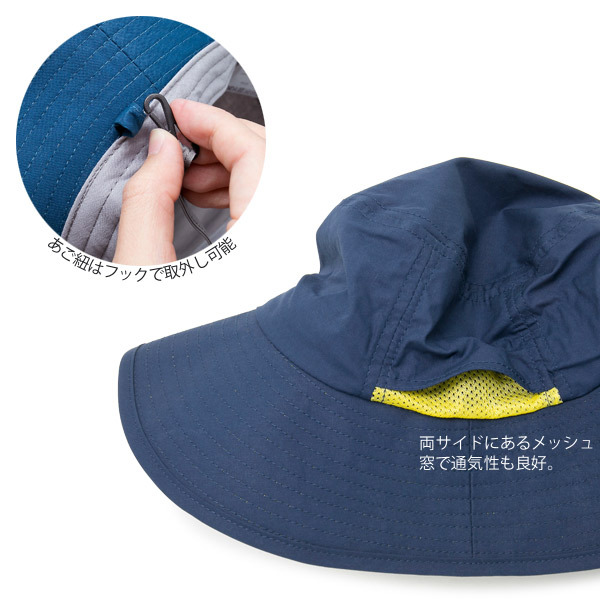 また、取外しのできるあご紐が付属しているので、風の強い日でも安心して被れます。