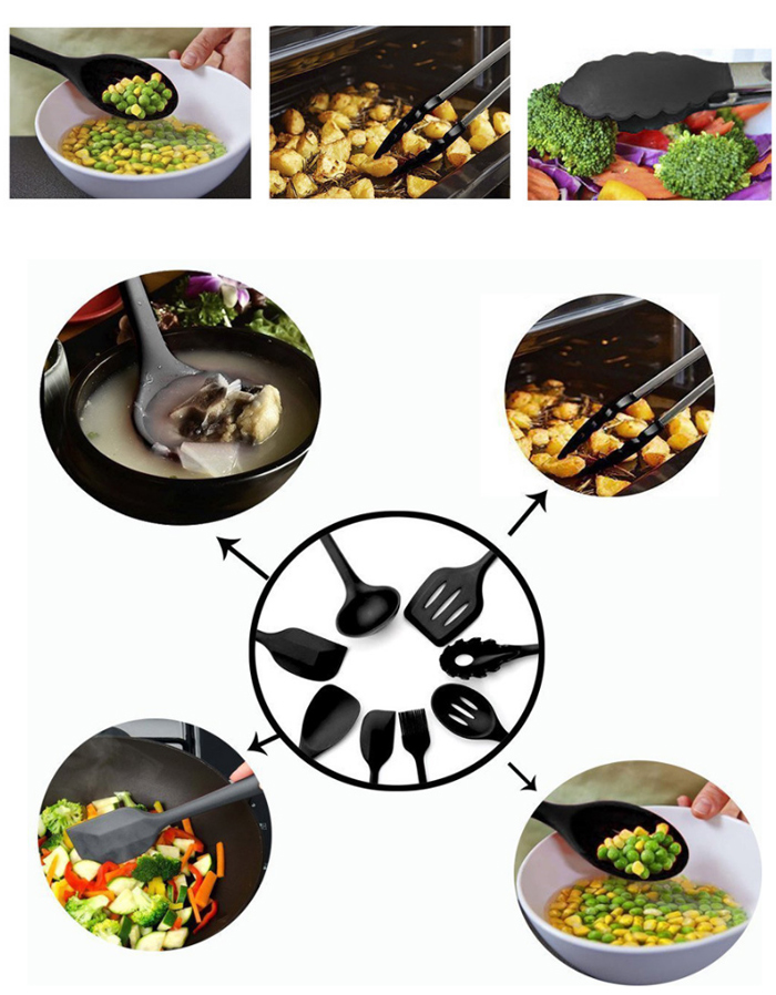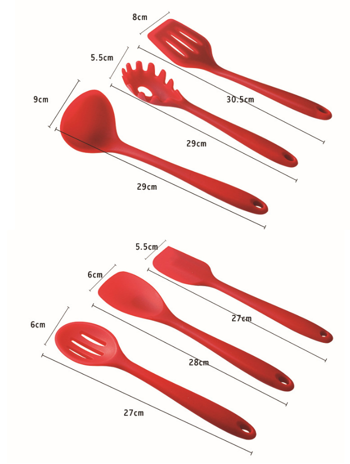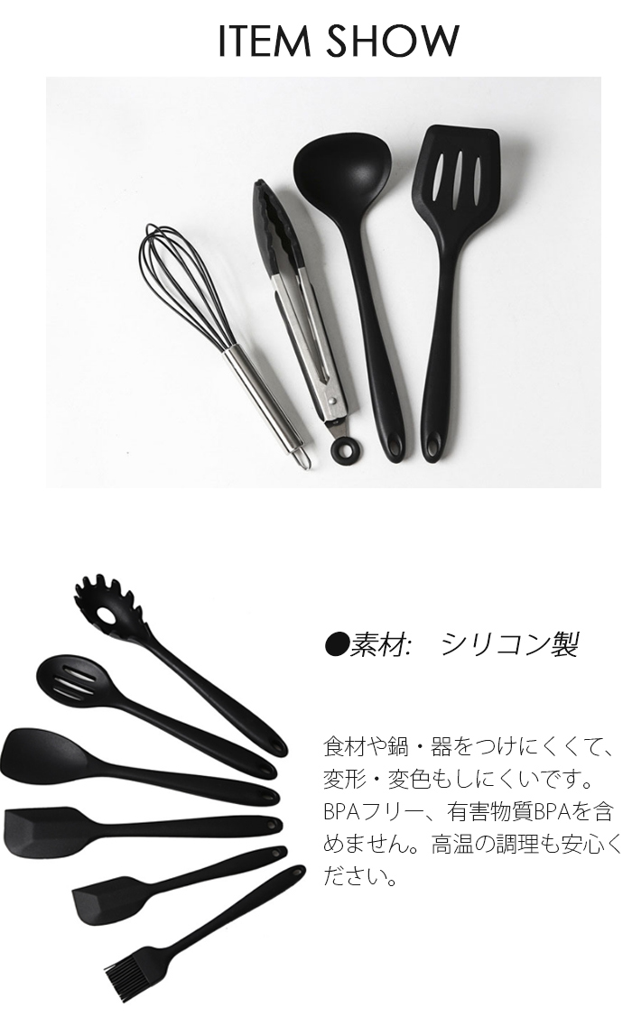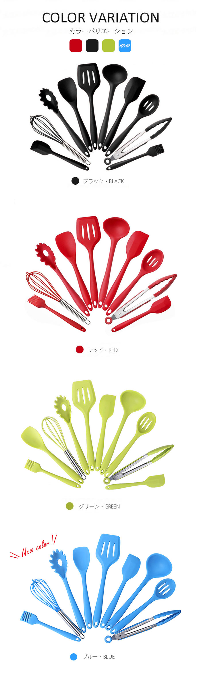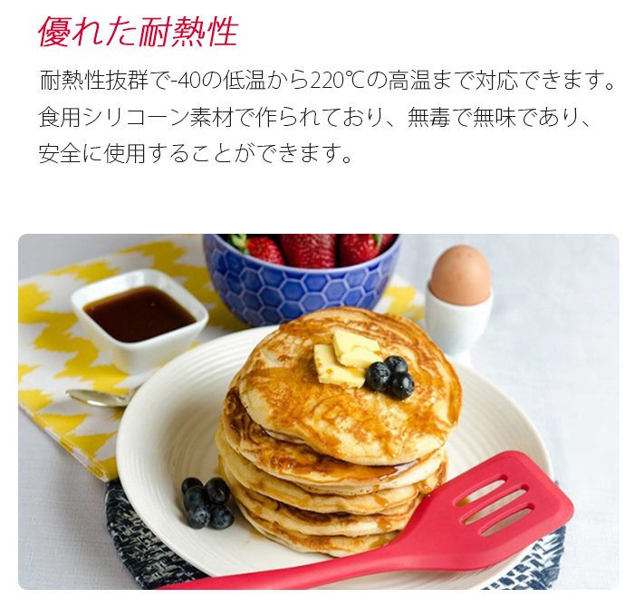このキッチン調理器具はシリコン製で、食材や鍋・器をつけにくくて、 変形・変色もしにくいです。