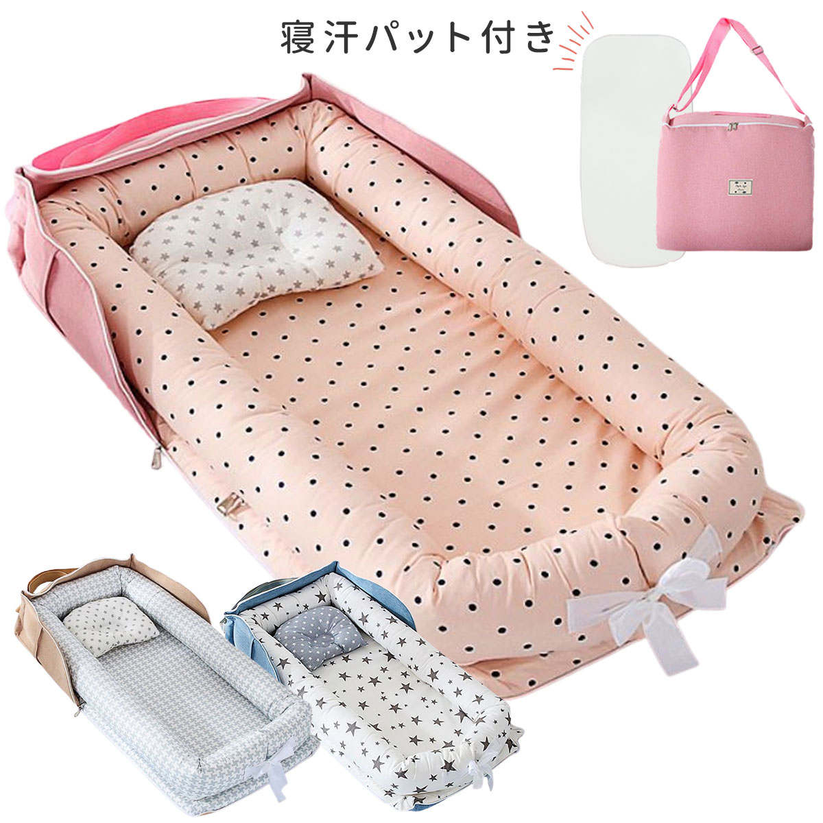 リボン部分を解けば簡単におむつ替えが可能です。通気性に優れたベッドシート付で、赤ちゃんの寝汗もしっかり吸収します。