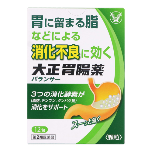 ●大正胃腸薬バランサーは、消化酵素が消化を助け、健胃生薬が胃腸機能を調節し、胃に留まる脂などによる消化不良・胃もたれを改善します。