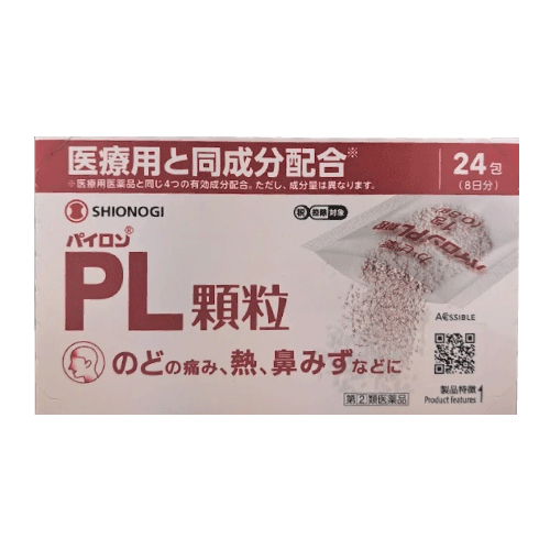 パイロンPL顆粒は、解熱鎮痛成分であるサリチルアミドとアセトアミノフェン、抗ヒスタミン成分であるプロメタジンメチレンジサリチル酸塩、痛みをおさえるはたらきを助ける無水カフェインの4つの有効成分の作用により、「のどの痛み」「発熱」「鼻みず」などのかぜの諸症状にすぐれた効果を発揮する非ピリン系のかぜ薬です。