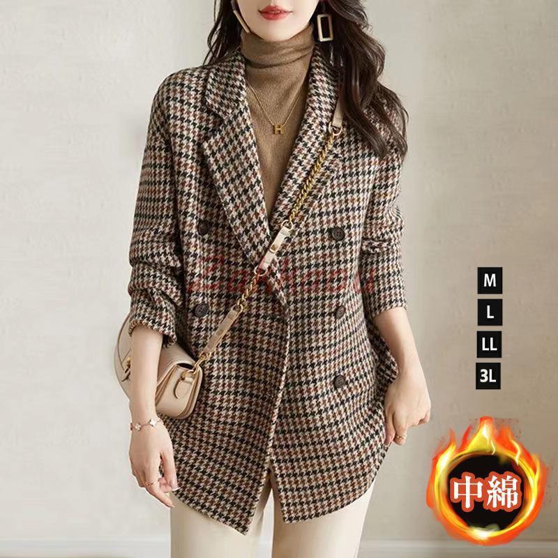 ジャケット レディース 秋冬 アウター 厚手 冬物 中綿入れ ラシャコート グレンチェックジャケット ブレザー テーラードジャケット オフィス 通勤 ゆったり