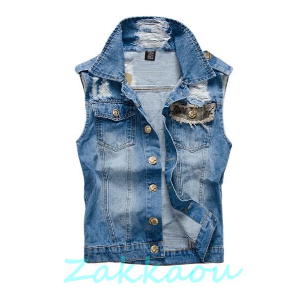 かっこいい デニムベスト カモフラージュ 切り替え スリム クラッシュ加工 前開きデニムベスト カジュアル アメカジ ミリタリー